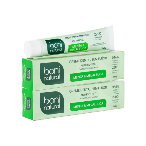 O Creme Dental Natural Sem Flúor Boni Natural Menta e Melaleuca possui fórmula que elimina 99,9% das bactérias causadoras dos males bucais, auxilia na prevenção de cáries, placa e do mau hálito.