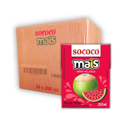 Água de Coco Sococo Mais Melancia 200ml Refresque-se com a deliciosa combinação da água de coco natural Sococo com o sabor leve e frutado da melancia. Ideal para hidratar e repor os sais minerais do corpo, mantendo você energizado e saudável.
