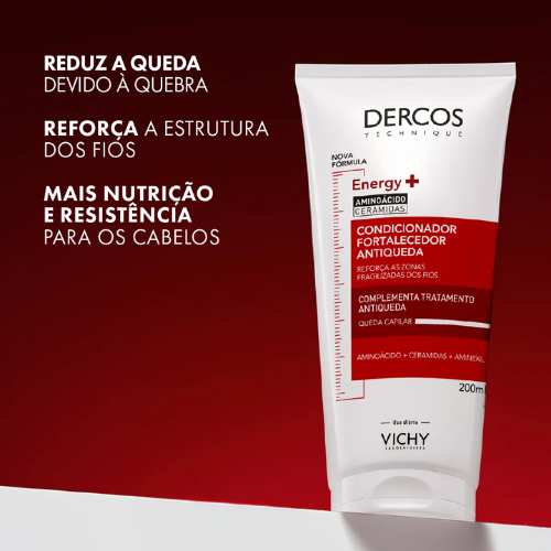 O Condicionador Fortalecedor Dercos Energy+ da Vichy foi desenvolvido especialmente para resolver esse problema. Sua fórmula avançada nutre intensamente e atua diretamente nas zonas fragilizadas, criando um filme protetor que reforça a estrutura capilar. É enriquecido com Aminexil, uma molécula de referência no tratamento antiqueda, que trabalha em sinergia com um complexo fortalecedor de Aminoácidos, Ceramidas e Vitaminas PP, B5 e B6.
